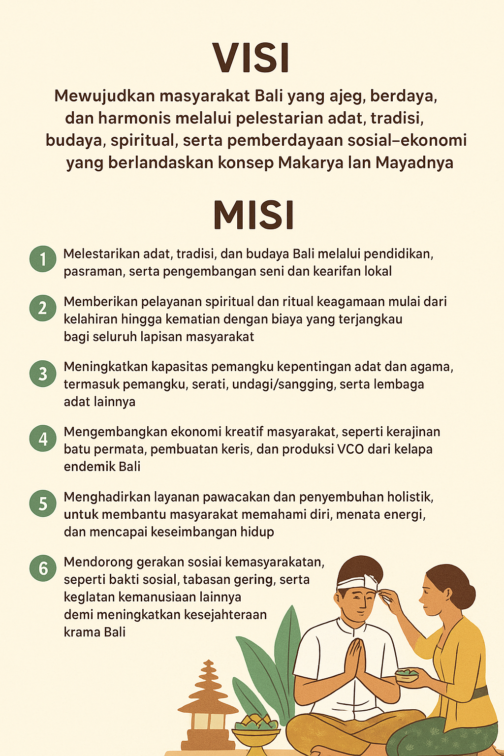 1. Melestarikan adat, tradisi, dan budaya Bali melalui pendidikan, pasraman, serta pengembangan seni dan kearifan lokal.